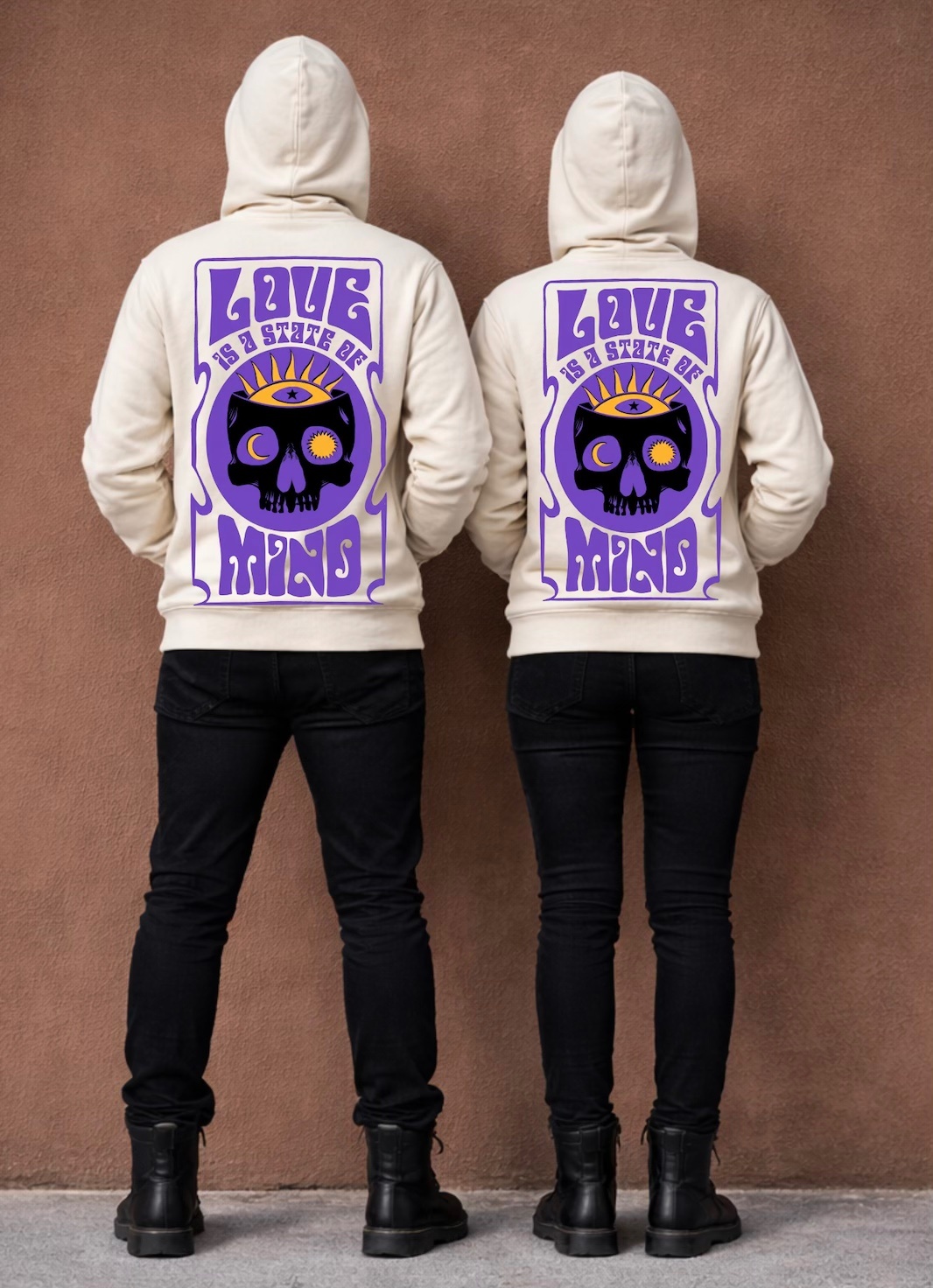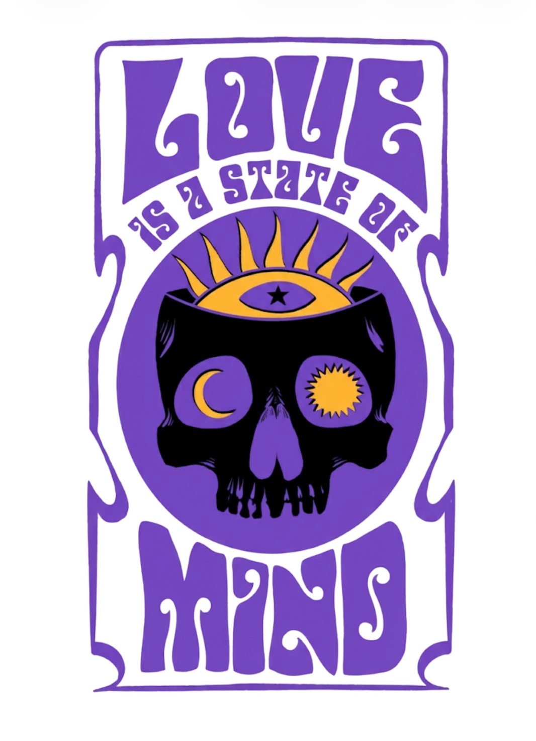 LOVE IS A STATE OF MIND is inspired by duality — logic versus emotion, light versus dark, calm versus chaos. The skull represents a mind alive under pressure, not broken but awake. The sun and moon symbolize opposing forces existing in sync — passion and reason, impulse and reflection.