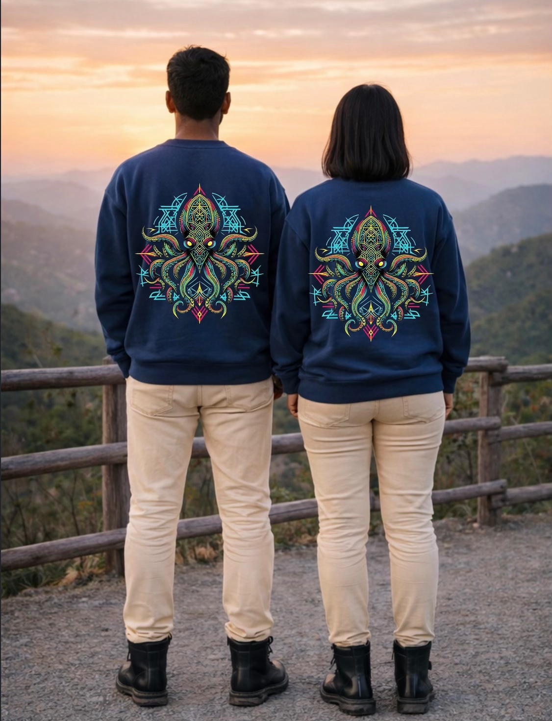 Straight from oceanic psychedelia, Abyss Kraken tentacles writhe with ancient power. Inspired by deep-sea mandalas, sunset horizons, and cosmic grip, the vibrant back graphic fuses geometric fury with mythical beast—perfect for paired vistas or solo ascents. It’s wearable abyss—claim the peak, let the kraken pull focus, and surf the edge between land and void. For golden-hour treks turning epic and fits blending nature with neon, Abyss Kraken holds you infinite.